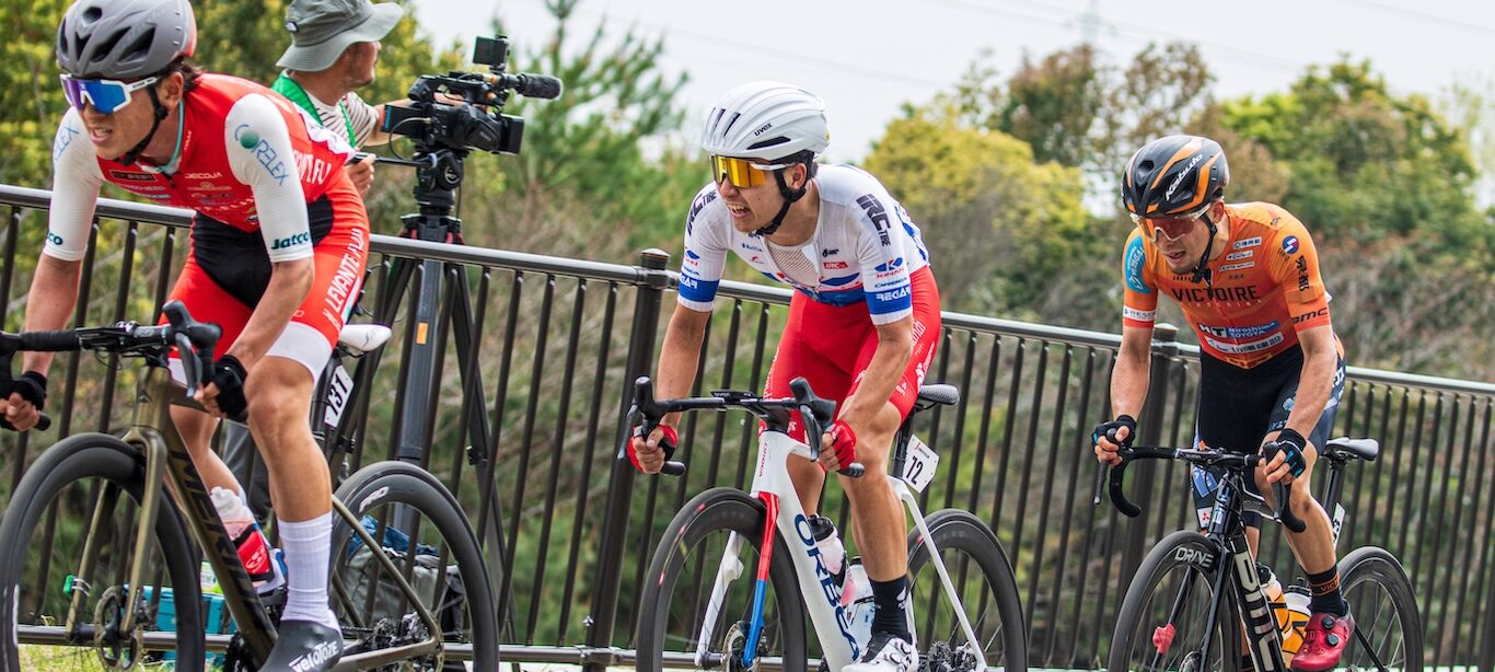 石原悠希選手(シマノレーシング)と石上優大選手(愛三工業レーシングチーム)の動きに合わせると、そのまま3人逃げの態勢に。