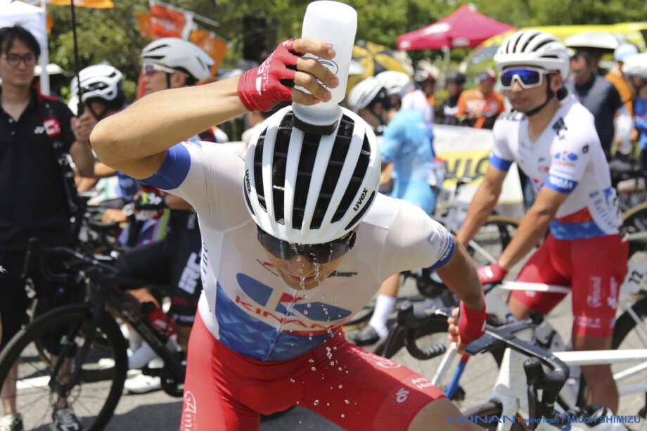 時折海からの風が吹くものの、強い日差しを受けるコースレイアウト。クリテリウムに補給ゾーン設定はなく、選手は手持ちのボトルを飲用したり、体にかけたりと工夫を凝らした。