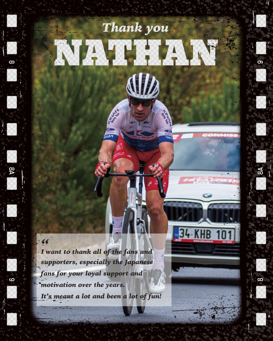当初は10月19日に開催される宇都宮ジャパンカップサイクルロードレースがキャリア最終レースとする予定で、ネイサン選手自身もかなりの意気込みをもって準備を進めてきましたが、同11日のマイナビ ツール・ド・九州2025福岡ステージでの落車により負傷。これにより、早期の選手キャリア終了を決断しました。